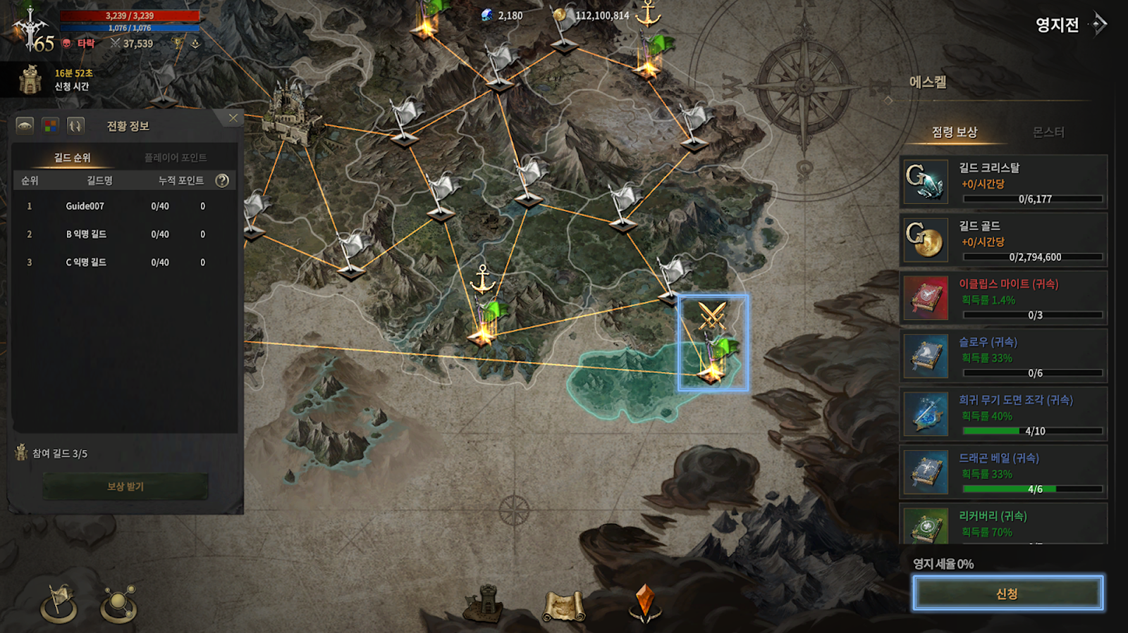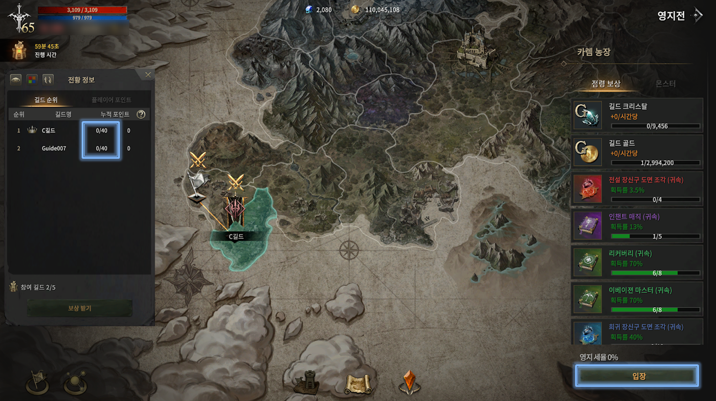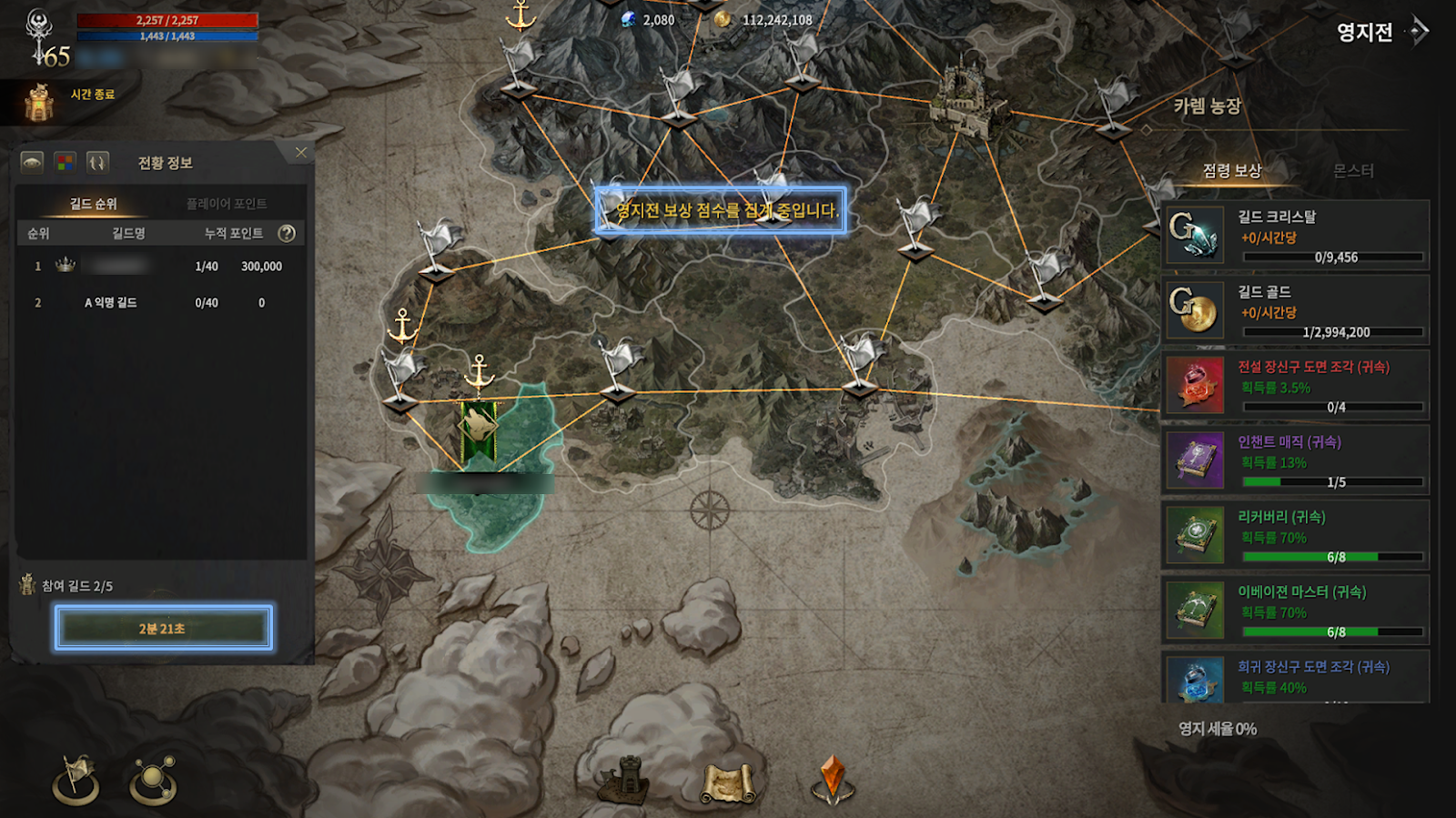 - 최소 조건 포인트를 충족한 길드 중 가장 높은 포인트를 획득한 길드가 해당 영지를 점령하게 됩니다.