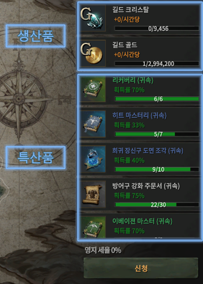 - 특산품은 해당 영지에서 생산되는 아이템으로 확률에 따라 획득하며, 길드 상점 등록 전까지 영지에 귀속됩니다.