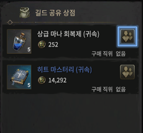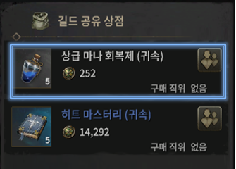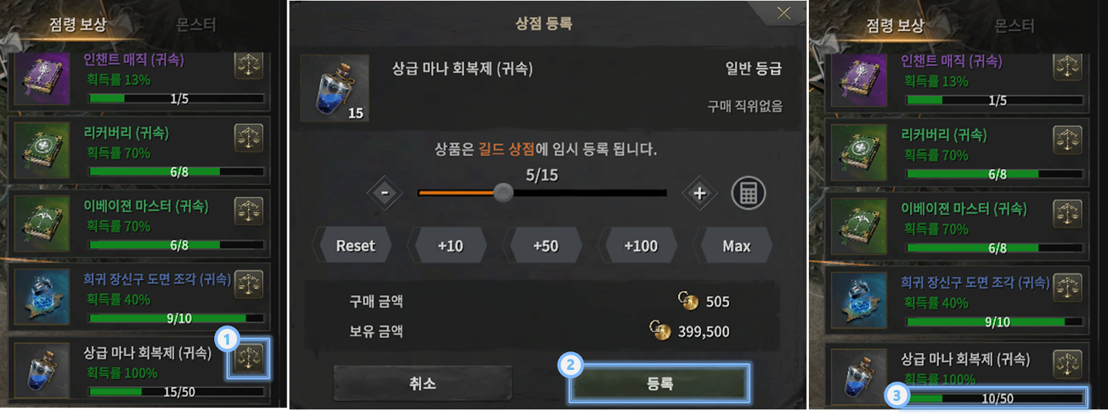 - 영지를 점령한 길드의 길드장은 보상을 수령 후, 길드 상점에 등록하여 길드원에게 판매할 수 있습니다.