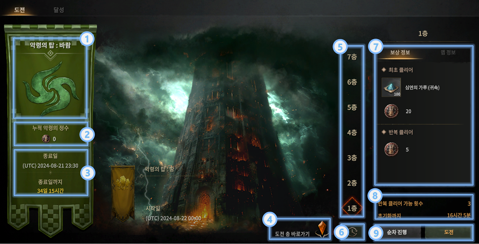 - 악령의 탑 UI 진입 시, 현재 진행 중인 악령의 탑 종류와 진행 기간, 누적 악령의 정수를 확인할 수 있습니다.