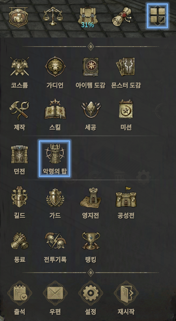 - 게임 화면 우측 상단의 메인 메뉴에서 [악령의 탑] 메뉴를 확인할 수 있습니다.