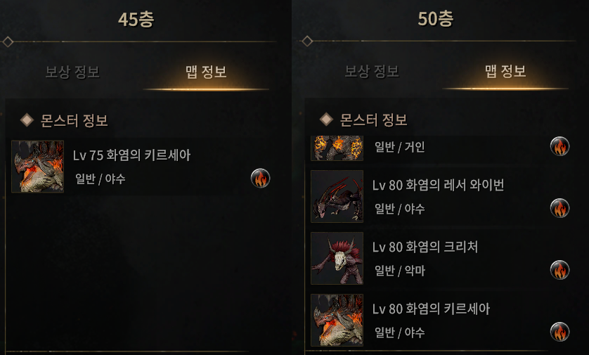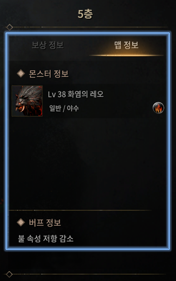 - 각 층의 [맵 정보] 탭에서 출현하는 몬스터와 전투 시 적용되는 버프/디버프 정보를 확인할 수 있습니다.