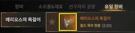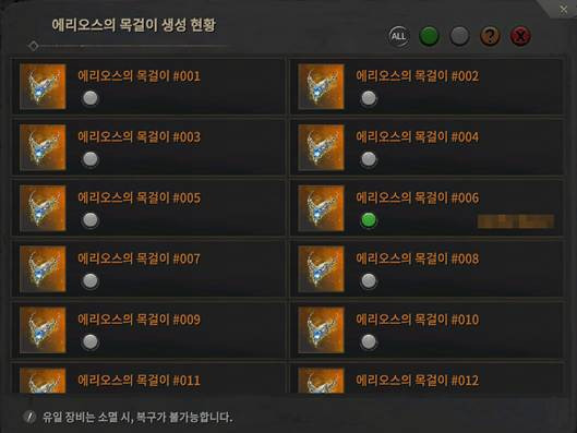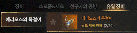 - 제작 수량 제한: 유일 장비는 월드 전체를 통합하여 제작할 수 있는 수량이 제한되어 있으며 최대 수량에 도달할 경우 더 이상 제작할 수 없습니다. 에리오스의 목걸이는 월드 전체 제작 수량이 20개로 제한되어 있습니다.
