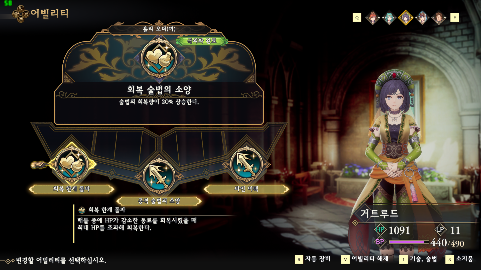 이 캐릭터가 아니더라도 다른 마력 높은 캐릭터를 힐러로 데려갈 때 회복 소양과 회복 한계돌파는 챙겨가는 게 좋고 오리지널 이하 난이도 하는 분들은 회복 소양만이라도 챙겨가는 게 좋은 거 같아요 나머지는 술법 대미지를 챙기거나 피격률 저하 또는 스탠스 를 낍시다 (극의화 조건은 세력7개이상 보유해야합니다)