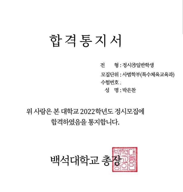 그런 박은찬군이 백석대학 사범학부 특수체육학과에 입학하게 되었고 목표인 교사의 꿈을 이루는데 한계단 발을 딛었습니다.