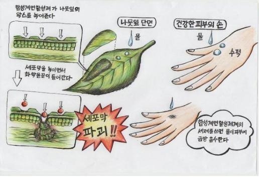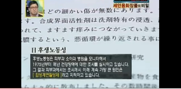 일본 경피독 연구소에서는 합성계면활성제가 많이 들어있는 화학제품을 오래 사용하면 피부만 망가지는 것뿐 아니라 이 성분이 피부로 몸 안에 침투되어 여성의 유방암, 자궁근종, 태아의 지능장애의 원인이 된다고 경고하고 있습니다.