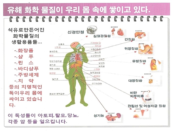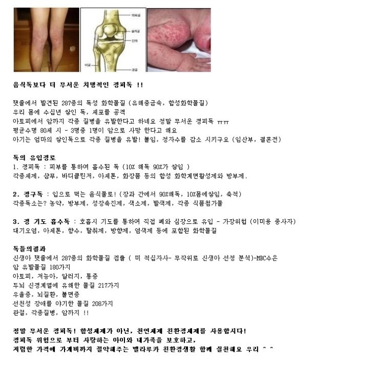 기형아 출생이 점점 늘어나고 불임의 원인이 되며 정신질환자의 증가 우울증,성장결핍 등 알면 알수록 무서워지는 경피독. "먹지마세요. 피부에 양보하세요" 피부는 좋은것만 흡수하는 것이 아니라 나쁜것도 잘 흡수합니다.