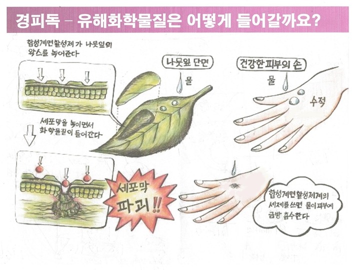 경피독은 세제나 화장품 같은 생활용품에서 비롯됩니다. 그것에 배합된 합성계면활성제는 화학물질의 피부흡수율을 높이고 그 자체는 체내에 쉽게 축적됩니다. 피부가 약하거나 알레르기체질이면 세제나 화장품이 피부에 닿기만 해도 이상이 나타날 수 있지만 보통은 화학물질이 피부로 흡수되어도 통증이나 가려움은 거의 느끼지 못합니다. 그래서 경피독은 더욱 간과하기 쉽다. 평소에도 피부를 통해 유해화학물질이 몸속으로 들어오지 못하도록 유의해야 합니다. 계면활성제는 원래 물과 기름을 융합시키는 물질입니다. 물과 기름이 서로 섞이면서 세정 효과, 거품을 일으키는 효과, 유화 작용, 정전기 방지, 살균 등의 많은 작용을 하게 됩니다. 이 계면활성제를 석유를 원료로 인공적으로 제조한 것이 합성계면활성제입니다. 저렴한 비용과 간단한 공정으로 만들 수 있는 장점 때문에 현재는 수백 가지나 되는 합성계면활성제를 다양한 생활용품에 이용하고 있다. 합성계면활성제를 주원료로 하는 세제가 합성세제입니다. 이 밖에도 섬유유연제, 샴푸, 린스, 화장품에도 합성계면활성제를 이용하고 있습니다. 생활의 편리를 위해 합성계면활성제가 만들어졌다고는 하나 경피독의 관점에서는 그 무엇보다 유해한 화학물질이니 주의하셔야 합니다.