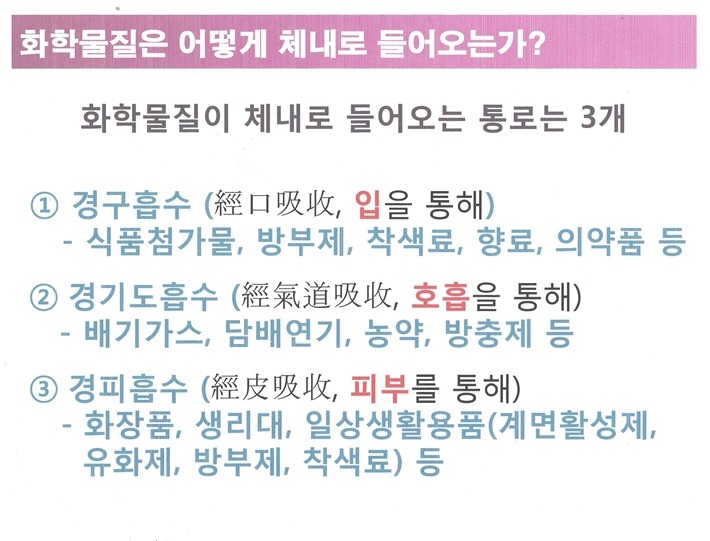 화학물질이 어떻게 우리 몸속으로 들어오는가? 화학물질이 우리 몸속에 들어오는 통로는 3개-입(경구흡수), 코(경기도흡수), 피부(경피흡수)