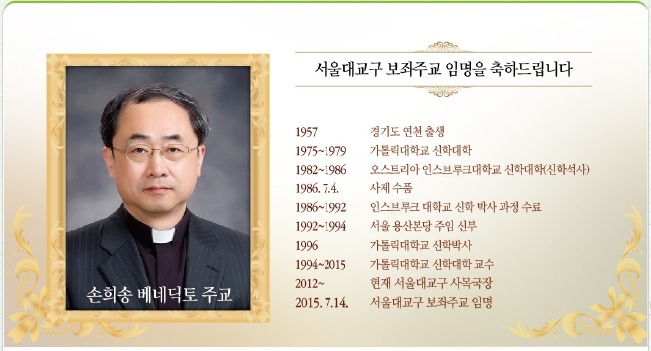 프란치스코 교황은 14일 오후 7시(로마시각 낮 12시) 서울대교구 손희송(베네딕토, 58, 교구 사목국장) 신부를 서울대교구 보좌 주교로 임명했다. 신임 손희송 보좌 주교 임명은 2013년 12월 유경촌ㆍ정순택 주교 임명 이래 1년 6개월여 만이다. 한 교구에서 현직 주교 5명이 주교단을 이루는 것은 서울대교구는 물론 한국 교회 사상 처음 있는 일이다. 손 주교 임명으로 한국 교회 주교(은퇴 포함)는 모두 37명(추기경 2명, 대주교 5명, 주교 30명)으로 늘어났다.