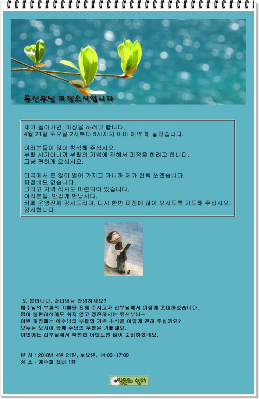 작성자아니마 작성시간 18.04.26 기다리던 피정에 참석을 못해서 분합니다. 제가 기관지염으로 치료를 받다보니 함께 참석하려던 베르띨라까지 불참하고 와~~~~아깝습니다 .
