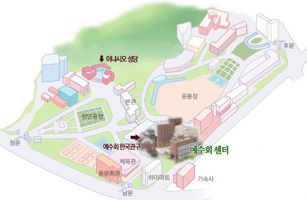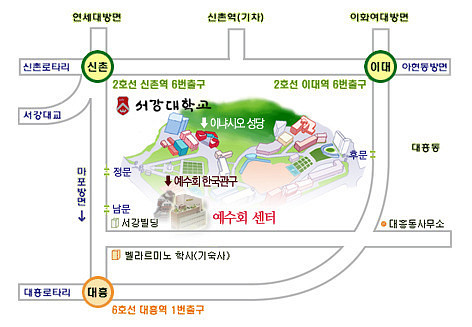 서강대 정문에서 대흥동 쪽으로 담을 끼고 돌아서 직접 예수회 센터로 들어오셔도됩니다.