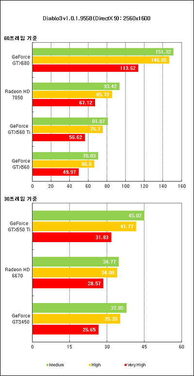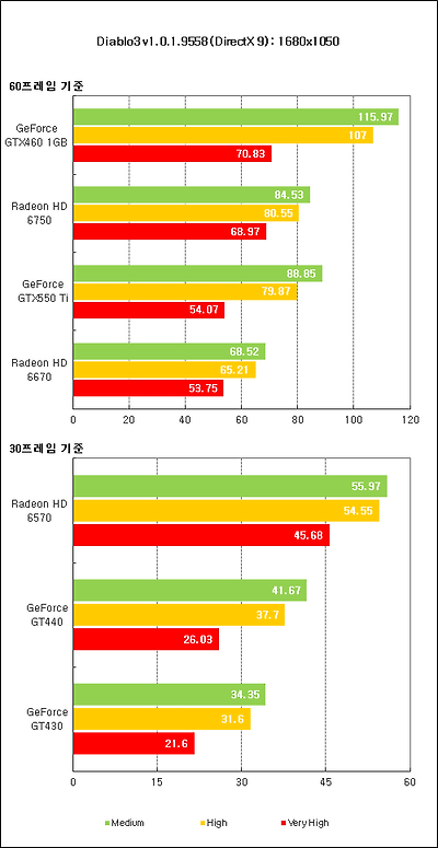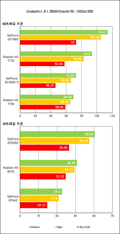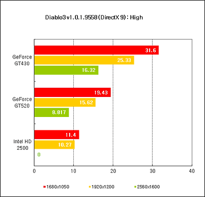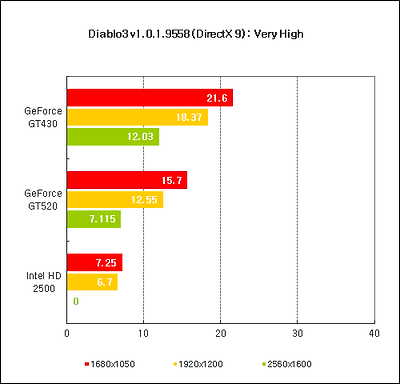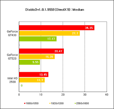 Medium 설정에서도 여전히 인텔 HD2500은 1680x1050 해상도해서조차 초당 최대 13.5프레임을 넘지 못하고 있다. 지포스 GT430은 1920x1200 해상도에서는 30프레임에 근접한 초당 27.7프레임, 1680x1050 해상도에서는 34.35프레임을 나타내서 충분한 게임 진행 성능을 보였다. 이 결과를 보면 내장그래픽으로는 디아블로3의 고해상도 게임 진행은 불가하다는 것을 알 수 있다.