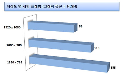 1920 x 1080 해상도에서는 80 프레임 중반 대를 기록했다. 1600 x 900 해상도에서 110 초반 대 프레임을 기록했다. 1360 x 768 해상도에서는 130 후 반대 게임 프레임이 상승했다.
