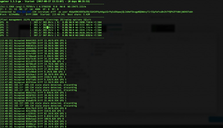 Averaging 655 h/s over 15 minutes. That works out to exactly 3 h/s per dollar spent on the video cards at a very low power output.