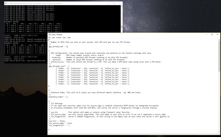 "platform_index" : 2,To break it down a bit, I am starting 4 GPU threads and assigning 2 threads per card, each with an intensity of 512 and worksize of 8. One video card is set to processor core 1 and the other to processor core 2. The Pentium G4400 is a dual core processor with no hyperthreading.