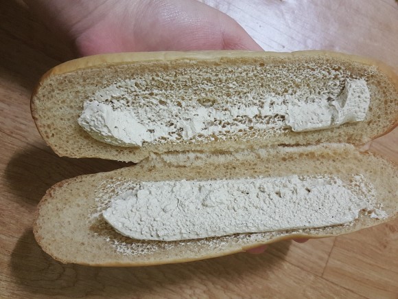 두 빵의 반을 잘라서 찍어봤습니다. 크림색이 확실히 China죠?