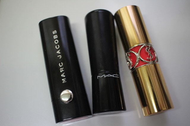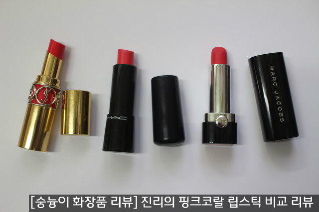 겉에 케이스를 먼저 비교하자면, (귀찮으니깐 그냥 브랜드만 말할게!!) 입생로랑(제일오른쪽)같은 경우에는 블링블링한 금색으로 정말 온 케이스에서 '나 비쌈'하고 티내는거 같은 느낌적인 느낌이야. 실제로도 제일 비쌈. 케이스만 보고 어떤 색인지 알 수 있다는 장점이 있지. 맥(가운데)같은 경우에는 미레랄라이즈 라인이어서 일반 총알립스틱이랑은 모양이 조금 다르지만, 그냥 검은색.심플해. 무슨색인지는 열어봐야 안다는 단점 ㅜㅜ마크제이콥스(왼쪽)도 검은색이지만 밑에 붙은 라벨로 색 구분이 가능해.