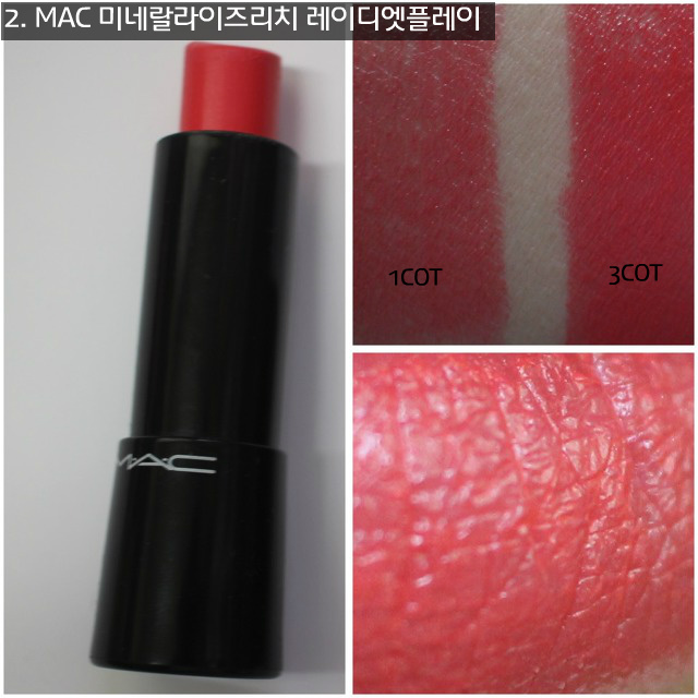 두번째는 맥의 레이디엣플레이야. 일반 총알립스틱들보다 조금 더 촉촉한+비싼 미네랄라이즈리치 라인이라 케이스가 달라. 촉촉한거 치곤 립스틱이 제법 단단한 제형이라 자주 써도 빨리 안닳는 느낌..? 작년에 샀는데, 립스틱에 사진에 보이는 저만큼밖에 안남았어ㅠㅠㅠ 진짜 입생로랑 사기 전까지는 저거만 일주일에 3번은 발랐던거 같아ㅋㅋㅋㅋ 맥은 직구가 최고라던데.. 돈벌면 맥 직구로 사야겠어 나쁜놈들 자꾸 가격을 야금야금 올려서ㅜㅜ 맥이 바비브라운보다도 비싸질날이 멀지않은거 같아. 아 아무튼, 립스틱 향은 다른 맥 립스틱들처럼 바닐라같은 향이 나고 정말 핑크+코랄이 반반정도 섞인 정직한(?)색인거 같아.