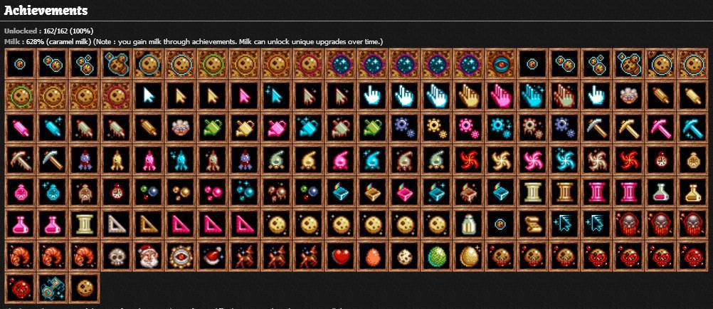 총 162개의 도전과제가 있고(1.0466 기준) 마지막 도전과제가 10^27개의 쿠키를 가지고 리셋하는 것이었는데 이 과제 하나에 200일 가까운 시간을 소모했습니다.