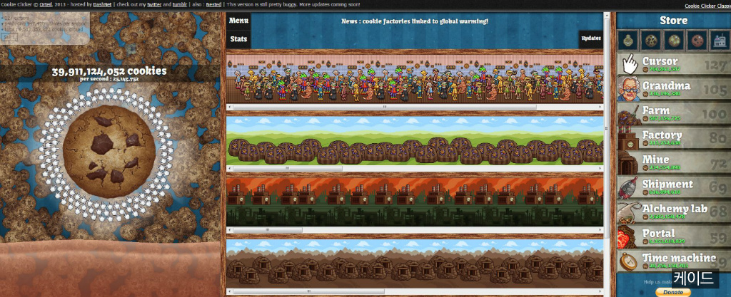 자동으로 쿠키를 클릭하는 커서나, 쿠키를 구워 주는 할머니, 쿠키 공장은 이해가 됩니다만 쿠키가 열리는 나무라던가 쿠키 광산이라던가... 외계의 쿠키를 가져오는 우주선이라던가 연금술로 금을 쿠키로 변환하는 거라던가(쿠키클리커 세계관에서는 쿠키가 화폐입니다. 쿠키로 건물을 구입할 수 있는 이유는 이 때문입니다.), 이세계로의 포탈을 열어서 쿠키를 가져오고 과거와 미래의 쿠키를 땡겨서 가져오고(관련 업그레이드에는 타임 패러독스 제거가 있습니다.), 최종적으로 프리즘을 이용해서 빛을 쿠키로 변환합니다.