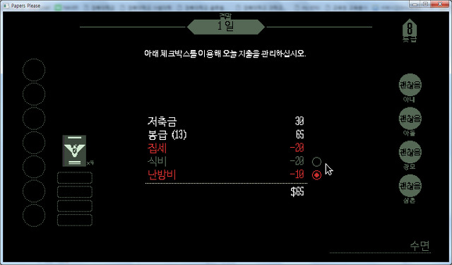 여기서 잠깐 게임 팁을 하나 주자면, 식비는 이틀에 한 번 씩만 줘도 모두 살 수 있다.