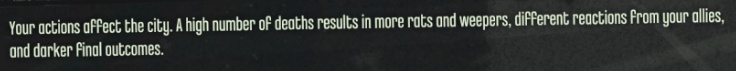 "당신의 행동은 도시에 영향을 미칩니다. 많은 사망자는 더 많은 쥐와 '우는 자(역병 말기 감염자)들', 당신을 대할 때의 동료들의 다른 반응, 그리고 더 어두운 결과를 낳습니다."