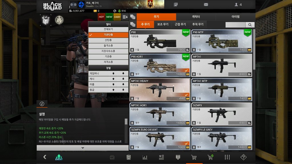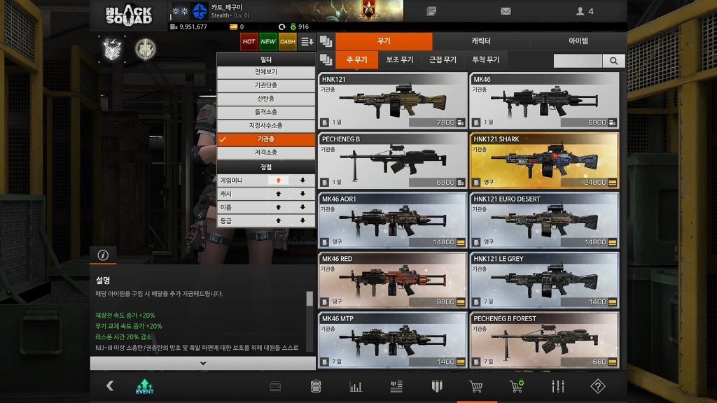 기관단총은 이속과 연사속도가 존-나빠르고 비비탄의 데미지를 가진게 특징이다