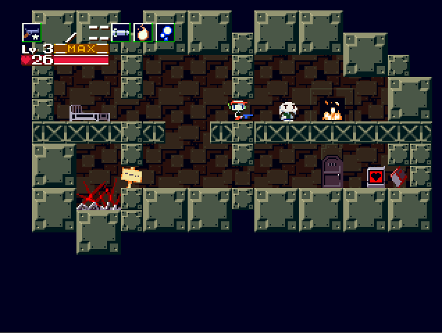 이름이 따악 써있다 cave story 아래에는 딱봐도 주인공 제작일은 2004년 12월 이라고 써있다 이게임은 처음에는 나약한 주인공의 몬스터 피하는 게임인줄 알지만 진행하면 총을 준다 그렇다 이게임은 미국의 좀비게임 주인공 처럼 총 하나든 주인공님 께서 모든걸 와장창 하는 내용일것이다