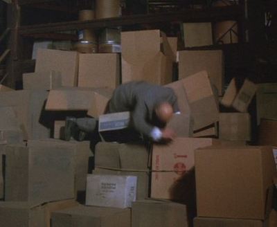 높이 쌓여 있는 상자들 앞에 서서 그녀를 뚫어지게 쳐다보고 있었다.