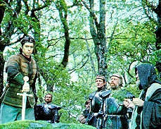 가끔 영국식 대사는 그 어두운 면으로 인해 위트 이상의 뼈아픔을 던져주고는 한다. 우더가 멀린에게 따지며 "그럼 내가 할 수 있는 것은 그저 살육하고 왕이 되는 것뿐이오?" 라고 하자 멀린은 냉정한 표정으로 답한다. "그것조차 아닐 수 있소"라고. 마치 <잠자는 숲속의 미녀>의 저주처럼 어린 아더를 안고 유유히 성 밖으로 사라지는 멀린을 쫓아 숲으로 달려가는 유더는 콘월 공작의 복수를 노린 잔당의 습격으로 목숨을 잃게 된다. 유더는 신검 엑스칼리버를 빼앗기지 않기 위해 마지막 힘을 다해 바위에 엑스칼리버를 꽂고 숨을 거둔다. 이때 멀린은 장차 바위에서 엑스칼리버를 뽑는 자가 왕이 될 것이라는 예언을 남긴다. 세월이 흘러 어느덧 성장한 아더는 자신의 형으로 생각하고 있는 케이의 기사수업을 겸한 무술대회 참가를 시종하기 위해 종자로 따라나서게 된다. 그리고 잘 알려진대로 무술대회 중 형 케이의 검이 부러지고, 급하게 검을 가져다 달라는 케이의 부탁에 급한 나머지 바위에 꽂혀 있던 엑스칼리버를 뽑아 가져다 준다. 무술대회에 참가한 기사들은 그것이 엑스칼리버라는 사실을 알게 되어 우왕좌왕하게 된다. 과연 이 어린 종자가 힘세고 명망높은 기사들도 하지 못한 일을 해냈단 말인가 하며 의심의 눈초리로 바라보는 것은 당연한 일이었다. 아더는 검을 다시 바위에 꽂고, 기사들로 하여금 뽑아 보도록 하지만 검은 뽑히지 않았다. 아더가 다시 검을 뽑자 이번에는 출신도 알 수 없는 사생아를 왕으로 받아들일 것인가를 두고 의견이 분분하지만 대개의 기사들은 그를 왕으로 받아들이지 못한다.
