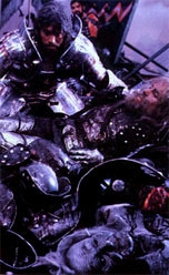 그는 교훈을 주지만 인간이 받아들이지 않을 때는 가혹하게 그를 버린다. 우더 펜드래곤은 마치 전국시대 통일과업을 목전에 두고 좌절한 일본의 '오다 노부나가'나 5호16국의 통일을 눈앞에 두고 죽어 결국 나라를 조광윤에게 빼앗긴 '시영', 통일까지는 이르렀으나 결국 오래 지속되지 못하고 무너진 진시황과 흡사하다. 무력을 앞세워 강하게 밀어부칠 줄만 알았던 이 사람들의 역사에서 교훈을 찾아내는 일이야 뭐 그리 어렵겠는가. 그러나 막상 닥쳤을 때 그것을 절제할 수 있는 것은 또 얼마나 어려운 일인가. 우더는 마치 다윗이 그러했던 것처럼 훌륭한 왕이 될 수 있었으나, 한 순간 욕정에 몸을 더럽힌 나머지 그야말로 3대가 꼬여 버린 것이다. 복수는 복수를 낳고, 부정하게 태어난 아더 역시 마법의 꼬임에 의한 것이라고는 하나 자신의 이복누이와 살을 섞어 모드레드를 태어나게 한다. 이 모든 것이 운명에 의해 결정되어진 일이라고만 한다면 <엑스칼리버>에서 교훈을 찾아내려는 시도는 접어야 할 것이다. (물론 이 영화에서 억지로 교훈을 찾아보자는 시도조차도 좀 무의미하다고 여기고 있기는 하다. 그건 일종의 강박증에 불과하므로...이 영화보다 좀더 선명한 교훈을 담고 있는 텍스트들은 쎄고 널렸다. 당장 불경이나 성경 한 구절을 펼쳐보라. 거기 어디 틀린 말이 있는가?)