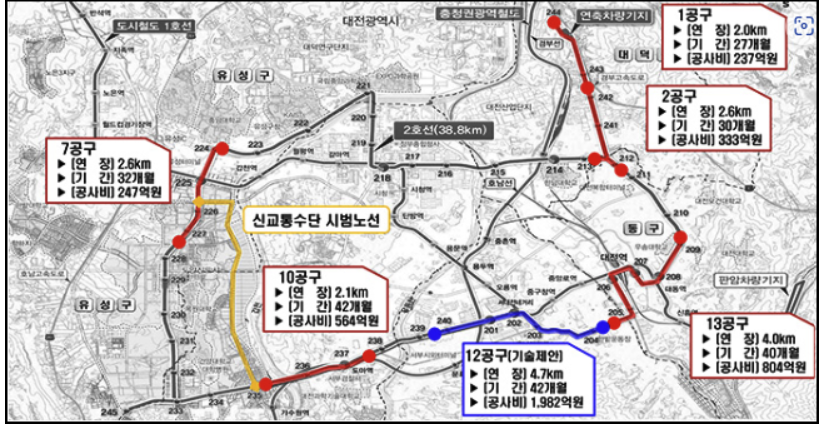 대전 도시철도 2호선은 총연장 38.8km로 대전 5개 자치구를 순환하는 순환선과 정거장 45개소 및 차량기지 1개소로 건설되며 총사업비 1조 5069억 원이 투입된다.