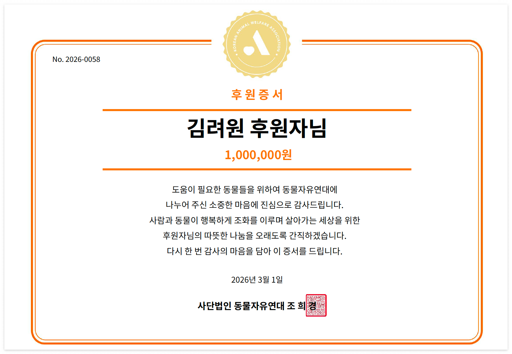 26년 3월 1일, <사단법인 동물자유연대> 측에 기부금 전달을 완료하였습니다.