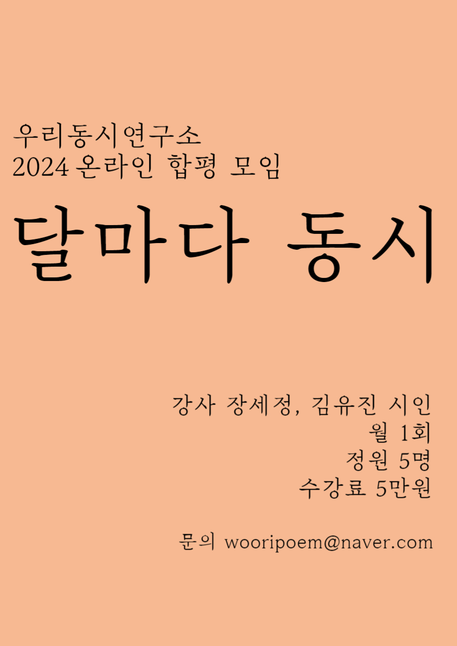 동시 합평 모임 안내 작성자김유진|작성시간24.06.12|조회수136 목록 댓글 0 글자크기 작게가 글자크기 크게가 https://docs.google.com/forms/d/1FSA6X8Da0mrXdzj42y9fSbaMSt7t0j-IlrNMHHVpLWw/edit상세한 안내와 신청을 링크를 이용해 주세요. 우리동시연구소 2024 온라인 합평 모임- 우리동시연구소에서 연중 진행하는 온라인 합평 모임을 시작합니다. 1월 개강해 매월 1회 진행합니다. 모임 시간은 수강생과 협의 후 확정할 예정입니다. - 우리동시연구소의 장세정(1-3월/7-9월docs.google.com 다음검색 현재 게시글 추가 기능 열기 북마크 공유하기 신고 센터로 신고 댓글 댓글 0 댓글쓰기 답글쓰기 댓글 리스트