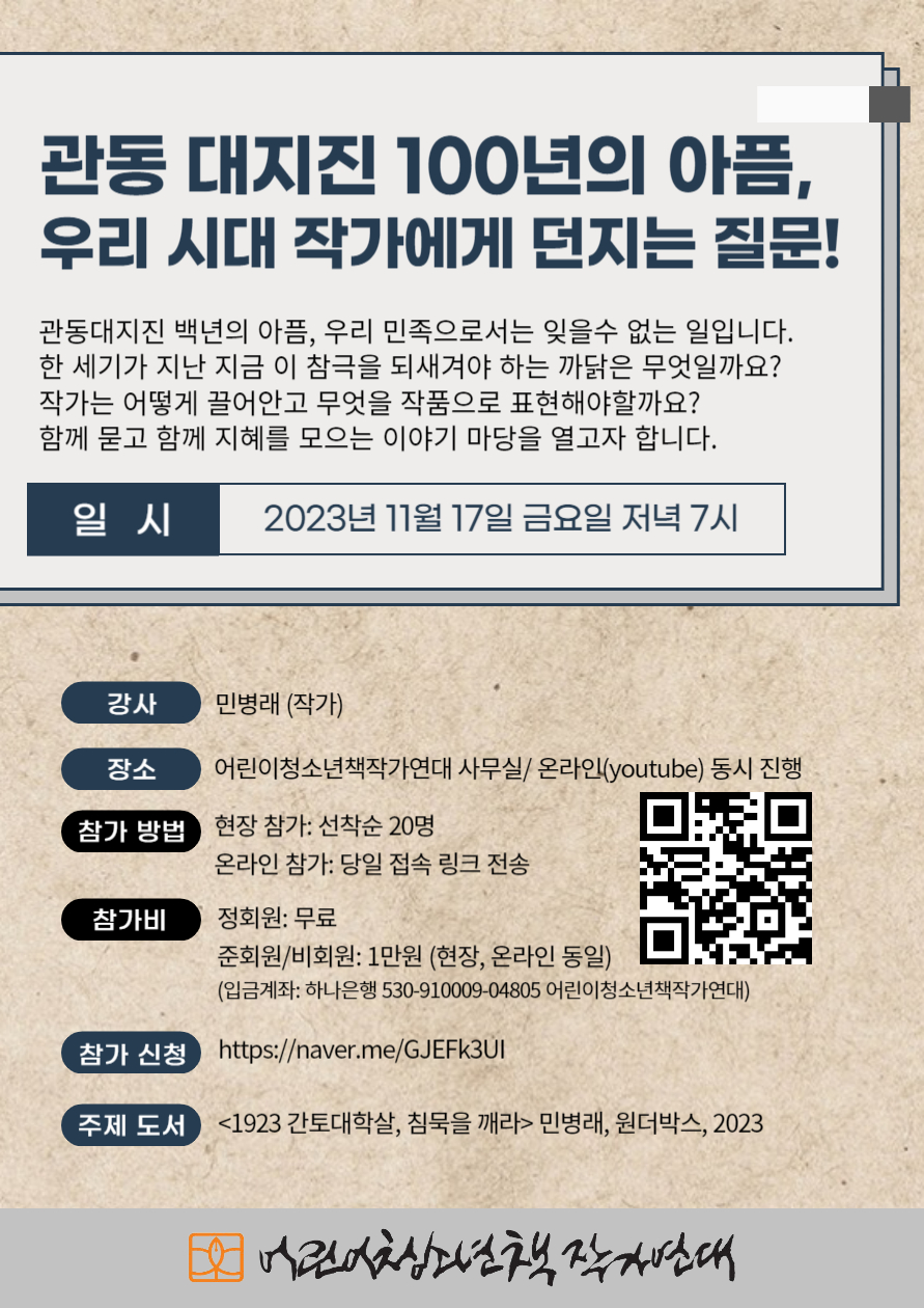 [강연 안내] 관동 대지진 100년의 아픔, 우리 시대 작가에게 던지는 질문! 작성자사무국|작성시간23.11.03|조회수143 목록 댓글 1 글자크기 작게가 글자크기 크게가 https://naver.me/GJEFk3UI[작가연대] 관동 대지진 100년의 아픔, 우리 시대 작가에게 던지는 질문! form.office.naver.com 다음검색 현재 게시글 추가 기능 열기 북마크 공유하기 신고 센터로 신고 댓글 댓글 1 댓글쓰기 답글쓰기 댓글 리스트 작성자임정자 | 작성시간 23.11.06 좋은 강연을 준비하셨네요. 감사해요 댓글 전체보기