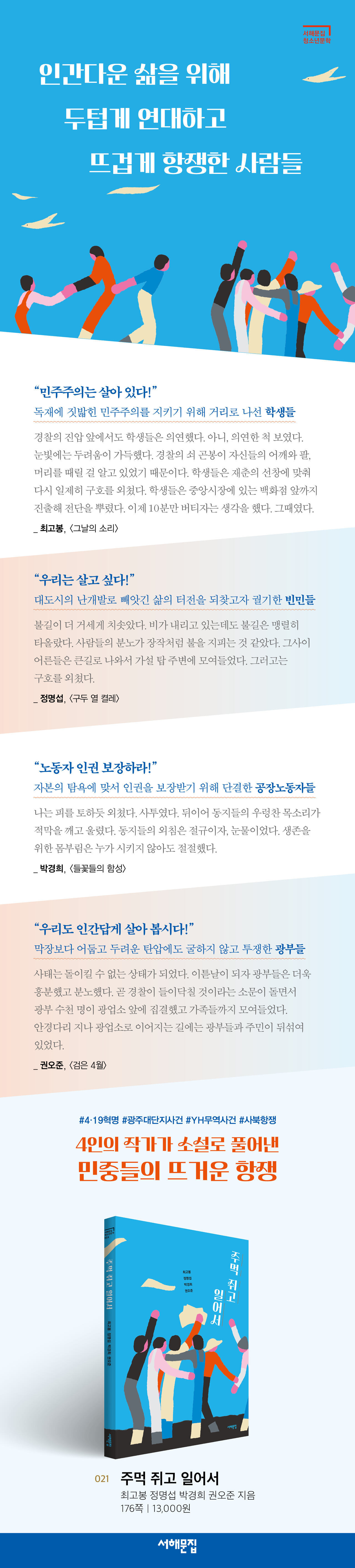 서해문집 청소년문학 21번째 책. 역사책이나 교과서에서는 자세히 알 수 없는 우리 현대사 속 ‘항쟁’의 모습과 의미를 4명의 작가가 각자만의 사려 깊은 시선으로 짧지만, 감동적인 소설로 풀어냈다. 4·19혁명에 앞서 강원도 원주에서 일어난 학생들의 시위(〈그날의 소리〉), 광주대단지사건이라 불리는 철거민들의 투쟁(〈구두 열 켤레〉), YH무역사건으로 알려진 공장노동자들의 궐기(〈들꽃들의 함성〉), 막장보다 어둡고 힘겨운 삶을 견뎌야 했던 강원도 사북 탄광 광부들의 항쟁(〈검은 4월〉). 비록 다른 시간, 다른 공간에서 일어난 일들이지만 이 항쟁들 속에서 우리는 인간다운 삶을 원했던 민중들의 뜨거운 마음을 오롯이 느낄 수 있다.