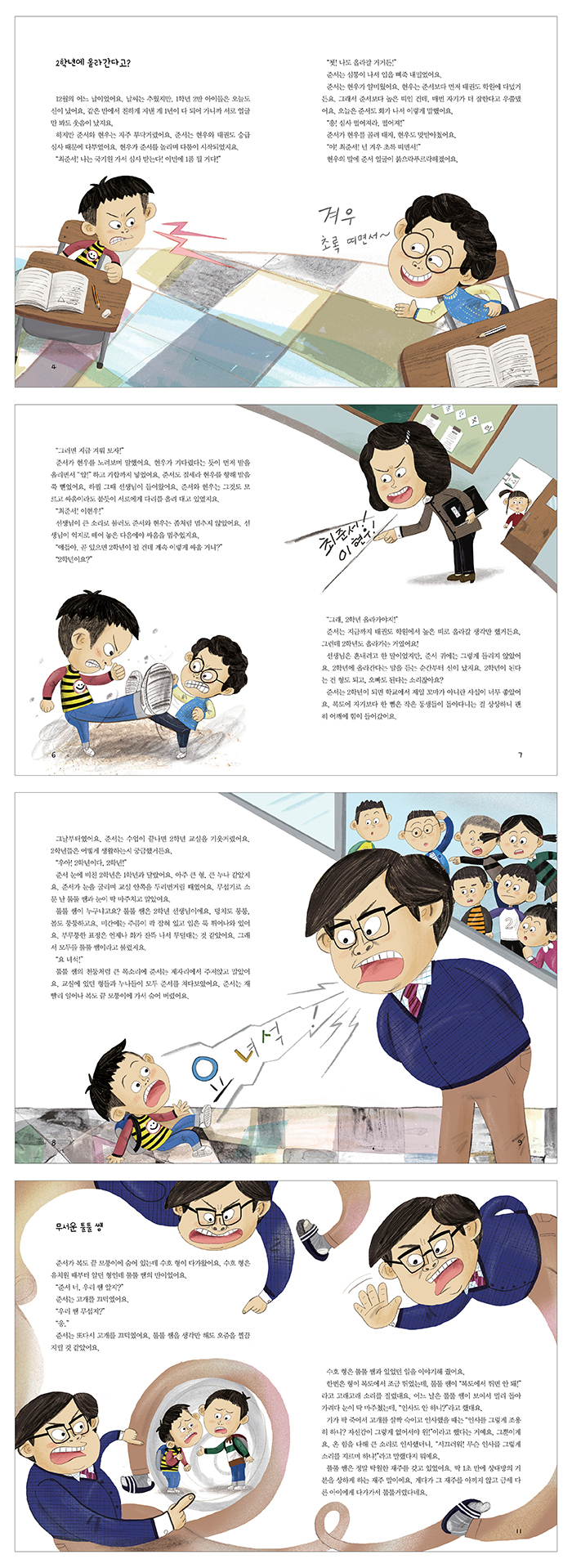 준서는 태권도 실력을 겨뤄 보자며 현우와 다투다가 곧 있으면 2학년이 될 건데 계속 싸울 거냐는 선생님의 훈계를 듣는다. 준서는 2학년에 올라간다는 말에 신이 나서 쉬는 시간마다 2학년 교실을 기웃거린다. 2학년 수호 형을 만난 준서는 무섭기로 소문 난 툴툴 쌤에 대한 이야기를 듣게 된다. 복도에서 준서와 현우가 또다시 티격태격하며 서로에게 발 차기를 한다. 그때 툴툴 쌤이 나타나 2학년 때 둘을 자기 반으로 데려와야겠다고 말한다. 그 말을 들은 준서는 눈앞이 캄캄해지고 어떻게 하면 2학년이 안 될 수 있을지를 골똘하게 생각한다. 준서는 1학년 교실에서 뭐든 잘하면 계속 1학년을 시켜 줄 거라는 엉뚱한 생각을 한다. 그래서 수업을 열심히 듣고 태후가 쏟은 음식을 닦아 주고 돈가스 반찬도 윤비에게 양보한다. 그 모습을 본 선생님은 준서에게 2학년이 될 준비를 잘하고 있다고 말한다. 선생님의 말에 실망한 준서는 2학년이 안 될 방법을 다시 생각하는데……?