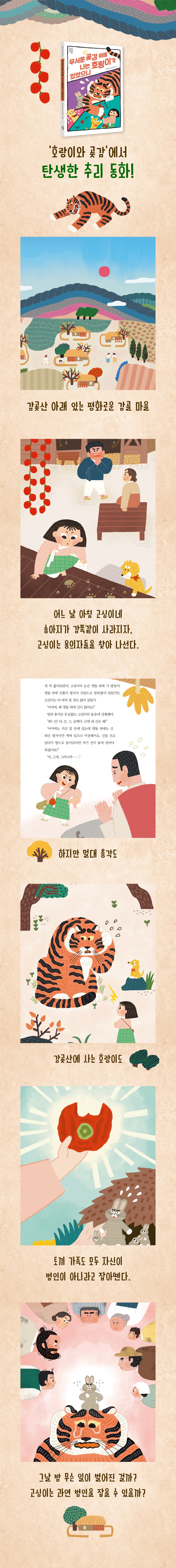 『무서운 곶감 위에 나는 호랑이가 있었으니』는 ‘호랑이와 곶감’ 이야기에서 시작한다. 감곶산에 사는 호랑이 맹맹이도 그 옛날 호랑이가 그랬던 것처럼 감골 마을에 소를 잡으러 내려왔다 울어 대는 아이와 엄마의 얘기를 엿듣게 된다. 그리고 무언가 털썩 등에 주저앉자 무서운 곶감인 줄 알고 소스라치게 놀란다. 하지만 이야기는 맹맹이의 줄행랑으로 흘러가지 않는다. 뜻밖의 사건으로 전환된다.