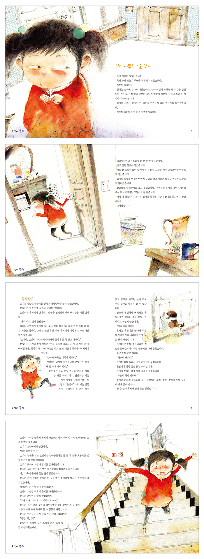 몰래 엄마의 지갑에서 돈을 꺼내는 일. 실행에 옮기고 아니고의 차이는 있겠지만, 어린 시절 누구나 한번쯤 생각해 보았을 법한 이야기입니다. 갖고 싶은 것, 하고 싶은 것은 많은데 부모님이 모두 들어 주지 않기 때문이죠. 『엄마 몰래』는 제목에서 느껴지듯이 주인공 은지가 엄마의 돈을 도둑질한 이야기입니다. 처음엔 돈을 손에 쥐고 신이 나서 이것저것 해 보지만, 시간이 갈수록 은지의 마음속은 후회와 반성으로 가득하게 됩니다. 누가 가르쳐 주지 않아도 스스로 쓸데없는 욕심이었음을 알게 되죠. 이 책은 이렇게 물 흐르듯 어린이 독자가 자연스럽게 느끼고 생각하게 합니다. 뿐만 아니라 저 아래 깔려 있는 가족의 사랑 또한 확인하게 합니다. 어린 시절 자신의 경험을 이야기로 써 낸 조성자 작가는 이렇게 회고합니다. ‘그때의 경험은 지금도 쓸데없는 욕심으로 마음을 훔치려고 할 때마다 제가 스스로를 채찍질하게 만드는 힘입니다.’ 이 작품에는 어린 시절 이야기를 쉽고 재미있게 풀어 낸 글 작가, 이야기와 함께 호흡하며 주인공 은지의 마음을 아름답게 그려 낸 그림 작가의 힘이 담겨 있습니다.