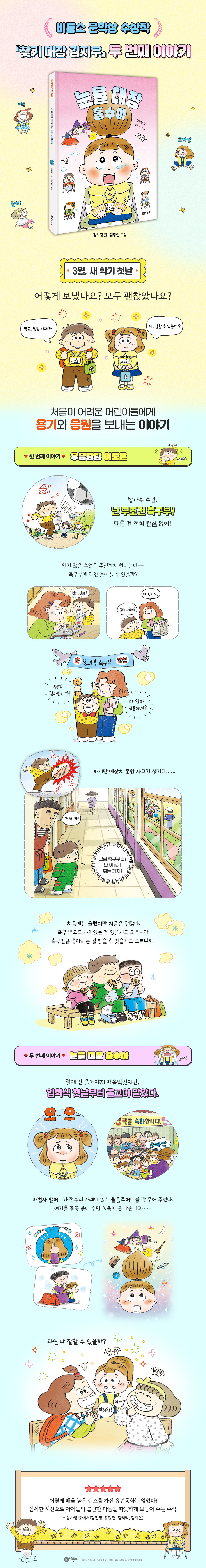 제13회 비룡소 문학상 수상작 『찾기 대장 김지우』의 두 번째 이야기 『눈물 대장 홍수아』가 출간되었다. 『눈물 대장 홍수아』는 『찾기 대장 김지우』에서 보여 주었던 장희정 작가의 섬세한 시선과 생생한 현장감이 여전히 돋보이는 작품으로, 지우네 반 다른 친구들의 모습을 통해 새 학교, 새 학기, 첫 시작을 앞둔 누구나 가질 수밖에 없는 긴장과 두려운 마음을 따뜻하게 어루만진다.