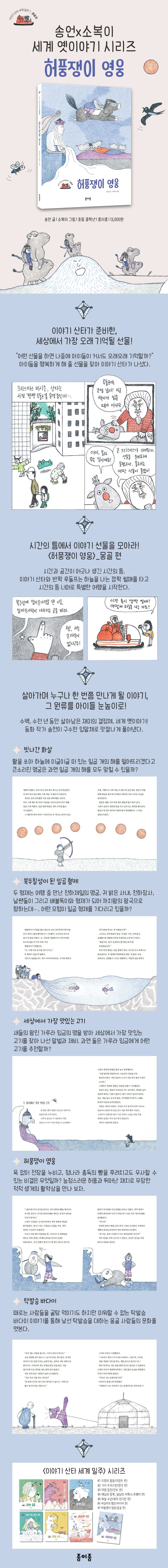일곱 번째로 둘이 도착한 곳은 바로 몽골! 과연 이야기 산타는 몽골에서 어떤 이야기를만날까? 그리고 하늘을 나는 깜짝 썰매에는 어떤 비밀이 숨겨져 있을까? 재미있는 옛이야기와 더불어, 액자 밖에서 펼쳐지는 이야기 산타와 반짝 루돌프의 흥미로운 모험담이 또 다른 재미를 선사한다. 이야기 산타의 이야기 세계 일주는 앞으로도 계속된다. 이야기 산타는 자신이 모아 온 옛이야기를 열한 권의 책으로 펴낼 생각이라는데? 몽골 편에 이어 남미, 아프리카, 오세아니아 등 전 세계를 돌며 모은 놀라운 이야기 선물도 기대하시라!