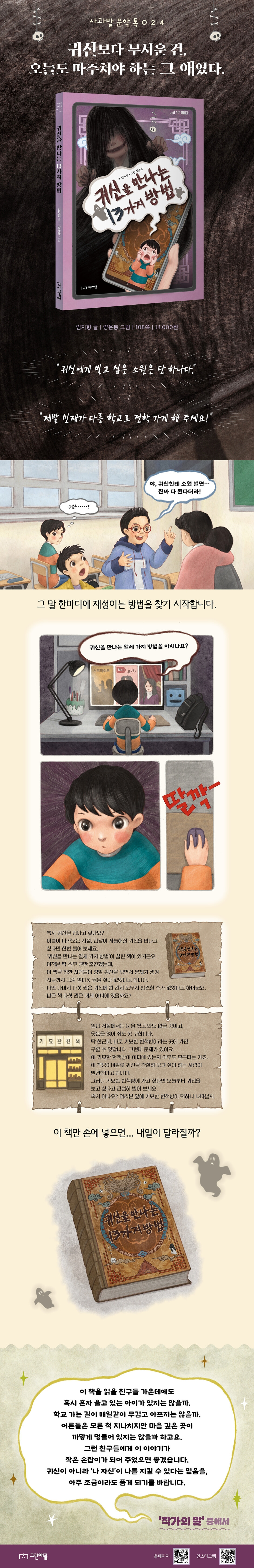 《귀신을 만나는 13가지 방법》 속에는 지금 아이들이 흥미를 느끼는 요소들이 촘촘히 박혀 있다. 유튜브 영상과 귀신 목격담, 숏츠처럼 짧고 자극적인 이야기, 새벽 3시에만 열리는 수상한 책과 ‘일주일 동안 하루 세 번 소원을 말하라’는 룰까지. 장례식장, 굴다리, 헌책방 같은 공간은 공포 분위기를 충분히 살리면서도 잔혹한 묘사를 피해 독특한 긴장감을 만든다. 그러면서도 이 책이 끝까지 붙잡고 있는 건 단순한 공포가 아니라 “내가 나를 지키는 방법”이다. 귀신에게만 기대어 모든 걸 해결 하고 싶었던 재성이가 장례식장의 소년, 굴다리에서 만난 아저씨와의 대화를 지나면서 조금씩 달라지는 모습이 섬세하게 따라붙는다. ‘도망치고 싶다’와 ‘말해야 한다’ 사이에서 흔들리는 마음, 소원을 빌면서도 계속 생기는 불안이 솔직하게 그려져, 비슷한 경험을 해 본 어린 독자들이 자연스럽게 자신을 겹쳐 보게 된다.