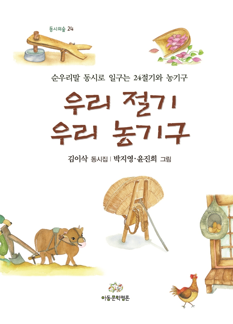 농기구는 농부와 한 몸이라고 합니다. 함께 땀 흘리며 더불어 조금씩 닳아 가므로, 한식구라고 해도 지나친 말이 아닐 겁니다. 예전의 농부는 농사짓는 일뿐 아니라 농기구를 만드는 일에도 열심이었으며, 그것은 곧 그들의 생활 일부이기도 했습니다. 농부들은 지게 한 틀을 쳐 내면서도 여느 공예가 못지않은 기쁨과 보람을 맛보았을 겁니다. 분신처럼 여겨, 늘 귀하고 깨끗하게 갈무리했고, 농기구를 고루 갖추려 애썼지요. 우리 농기구가 형태에 따른 다양함 못지않게 풍부한 부분 명칭을 지닌 것도 그에 대한 지극한 애착의 결과라 해도 넘치는 표현은 아닐 겁니다. 시대의 변천에 따라 재래 농기구가 사라져 가는 것은 어쩔 수 없다 하더라도, 부분 명칭마저 희미해지는 것은 겨레말의 내일을 생각하면 참 안타까운 일입니다. 그래서 좀 특별한 동시집을 내고 싶어 ‘농기구’의 종류와 24절기를 시 속에 담았습니다.