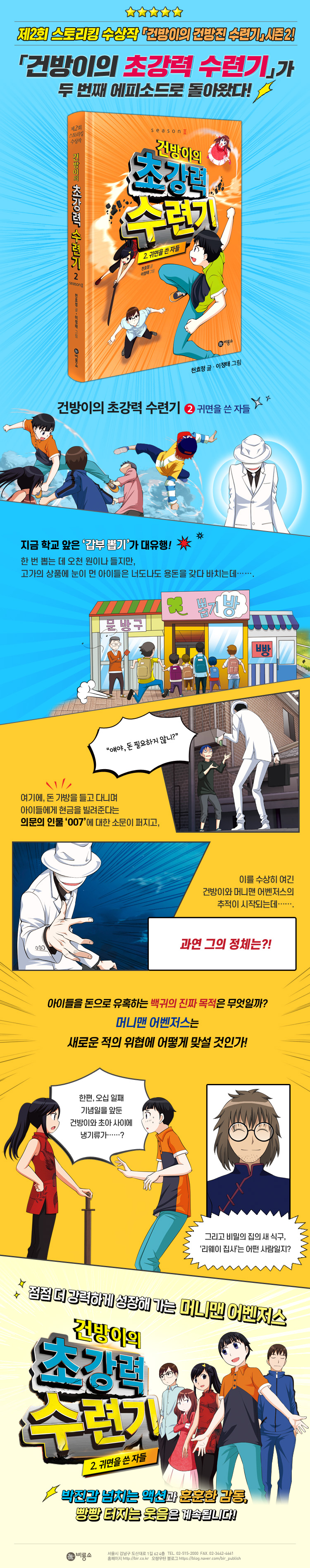 본격 어린이 무협 동화 시리즈 「건방이의 건방진 수련기」가 다섯 권으로 완결되고, 이를 아쉬워하던 팬들의 열렬한 요청에 응답하며 등장한 시즌2 「건방이의 초강력 수련기」. 확 달라진 캐릭터와 생생한 액션 묘사로 신선한 충격을 안겨 주었던 첫 권에 이어, 두 번째 이야기가 출간되었다. 1권 ‘머니맨 어벤저스’에서 건방이와 친구들은 ‘적귀’라는 무시무시한 적을 물리친 바 있다. 그러나 이와 같은 ‘귀면을 쓴 자들’이 계속해서 나타날 거라는 도검 장인 타타의 경고대로, 2권에서도 기괴한 가면으로 얼굴을 가린 사악한 적이 나타나 머니맨들을 위협하는데……. 시즌2에서 새롭게 결성된 ‘머니맨 어벤저스’가 이번에는 어떤 액션으로 또 한 번 통쾌한 승리를 선사할지, 기대감을 갖고 지켜봐도 좋다.