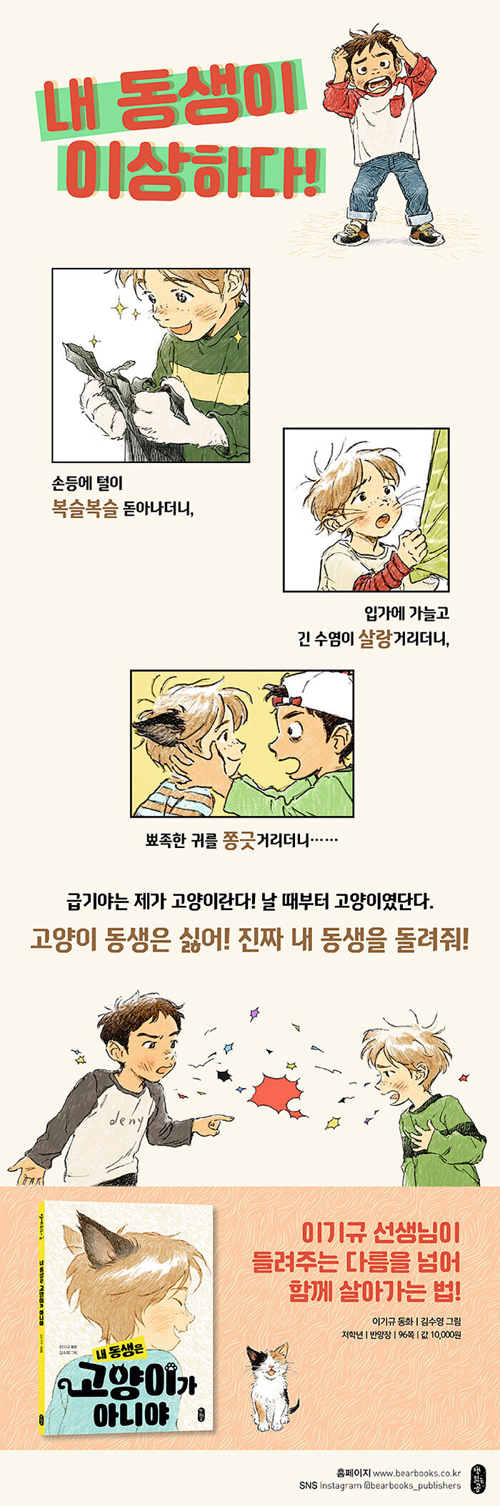 가족이나 친구가 느닷없이 “나는 사실 고양이야!” 하고 고백해 온다면 어떤 기분이 들까요? “에이, 농담하지 마.” 하고 받아칠 수도 없을 만큼 진지한 얼굴로 말이지요. 여기 세상에 둘도 없는 동생에게서 이런 고백을 들은 아이가 있습니다.