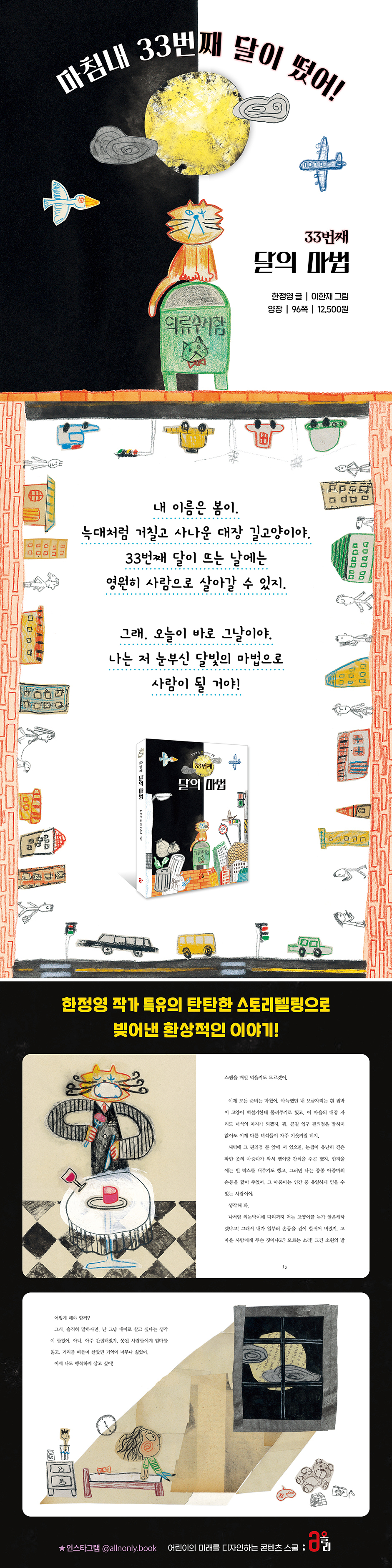 《33번째 달의 마법》은 그림책부터 동화, 어린이 논픽션까지 다양한 장르에서 활동하며 스토리텔링에 능한 한정영 작가의 작품입니다. 언제나 위험을 안고 살아가야 하는 길고양이와 이타적인 마음을 가진 소녀의 이야기를 작가의 필력과 상상력으로 잘 버무려 풀어냈습니다. 여기에 아이들이 좋아하는 마법과 변신 키워드를 넣어 환상적인 분위기를 만들어 냈지요. 그림을 맡은 이한재 작가는 특유의 톡톡 튀는 연출, 인물의 생생한 표정과 다양한 동작을 표현하며 읽는 재미를 더했습니다.