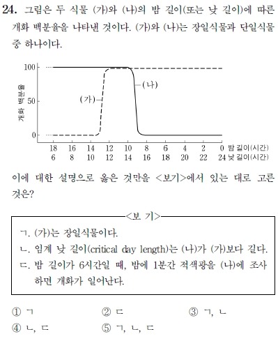 답댓글 작성자앙앙a 작성시간 14.05.23 (나)는 단일식물 즉, 장야식물입니다. 적색광은 빛을 비추는것과 같은효과로 밤의 길이를 무효화 할 수 있습니다. 따라서 밤 길이가 6시간보다 짧아지는 것과 같습니다. 이 때는 개화가 일어날 수 없죠. 저는 이렇게 생각했는데 혹시 틀린게 있다면 지나치지 마시고 알려주세요^^