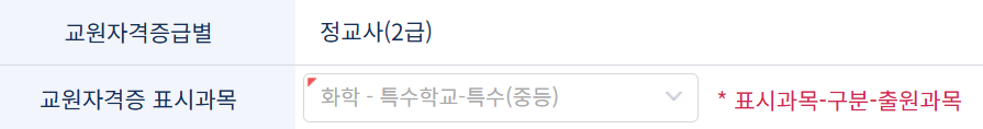 교원자격조회 후 자격증을 선택하면, 사진과 같이 교원자격증 표시과목의 구분이 특수학교로 뜹니다.