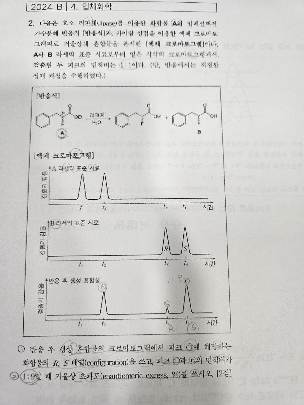 크로마토 그램 A 결과에서 1:1 검출 된 것은 A는 R과 S배열이 1:1 만큼 혼합 (정보를 준 것 임. 반응물의 양 아님)